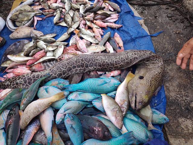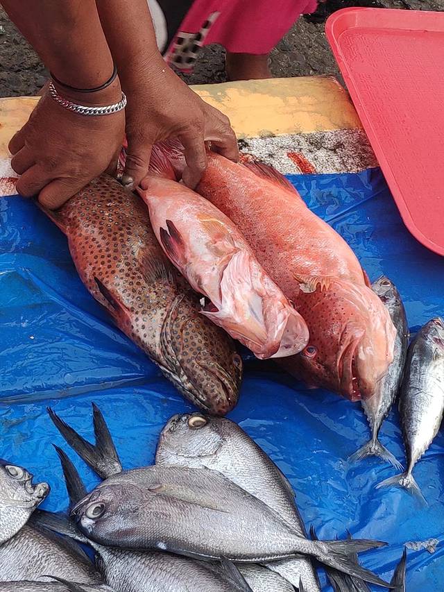 这大金枪棒子看着就很好吃吧,老板看见我走过来,立马从摊位下面的泡沫盒子里掏出来好东西,LAPO‘LAPO,原来这就是我们那晚吃的大鱼本来的模样,看着很鲜艳。