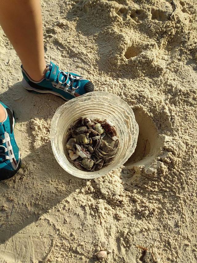 昨晚做的螃蟹陷阱,确实收获不少,但困了一晚上,已经都臭了。