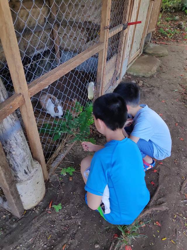 远处平静的海边,已经有人在玩水了,大早上的其实海水可凉了。两个男孩子不一会也都下楼来跟着我四处转了,门口的兔子窝成了他们俩的动物园。
