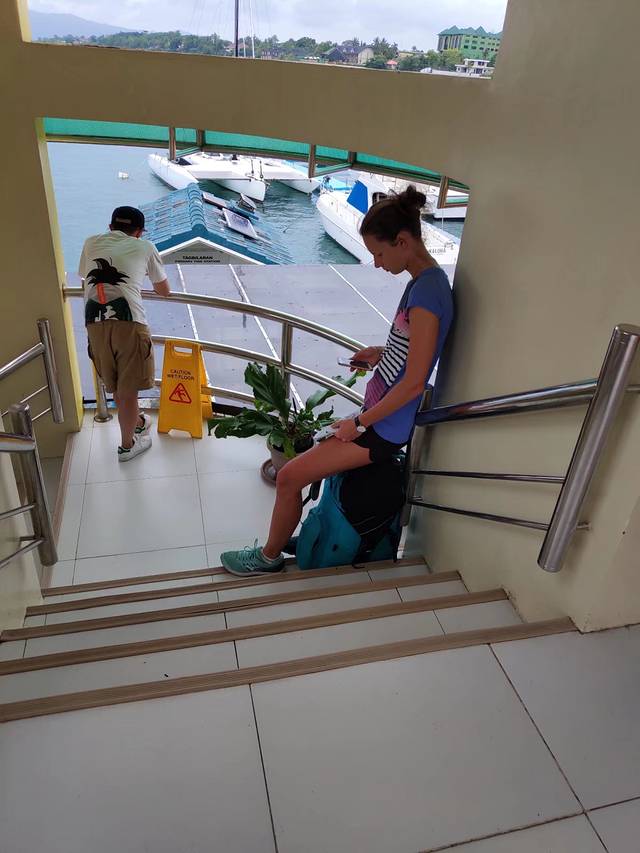 这个外国大妹子也是去锡岛的,眼看着开船的时间到了,有些班次已经因为天气取消,大家都到了走廊里四处询问,工作人员只是安慰我们“不要急,船会来的”。又过了半个小时,看见我们的行李被工作人员从码头推了回来,大家傻眼,我们的船也取消了今天的行程。后续的房间,以及当天的安排,都还没想好。