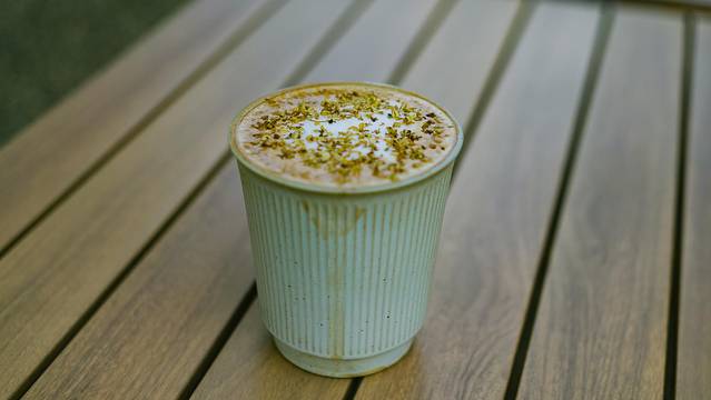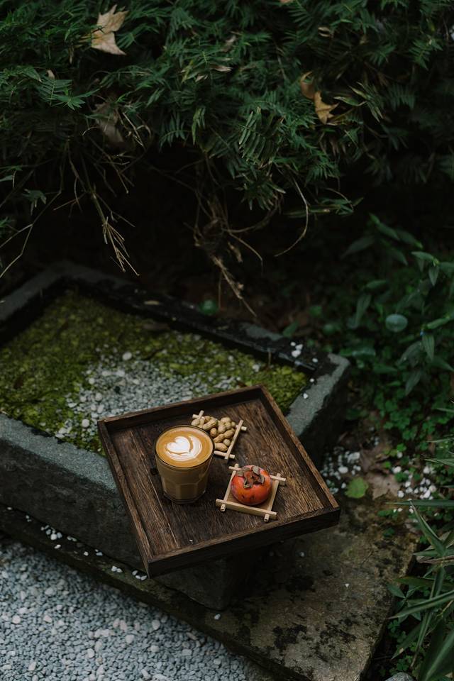 深秋的风开始舒适起来,我们按着线路指示坐公车来到运河边的四合院茶馆,点了一份一人套餐,名字都晓有趣味——花生好柿。我本来是不喜欢吃柿子的,这里的柿子倒是给了我一份秋天的superstar,一颗熟透的柿子,搅拌着吃,柿子香味蔓延开来,软糯香甜的口感在口腔中延伸。咖啡特意用了深烘黑巧拼配,用柿子原生的香甜包裹了咖啡的焦糖香,好似我一口喝尽了秋天的滋味。