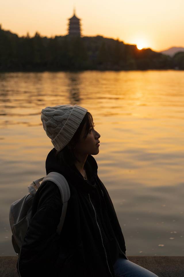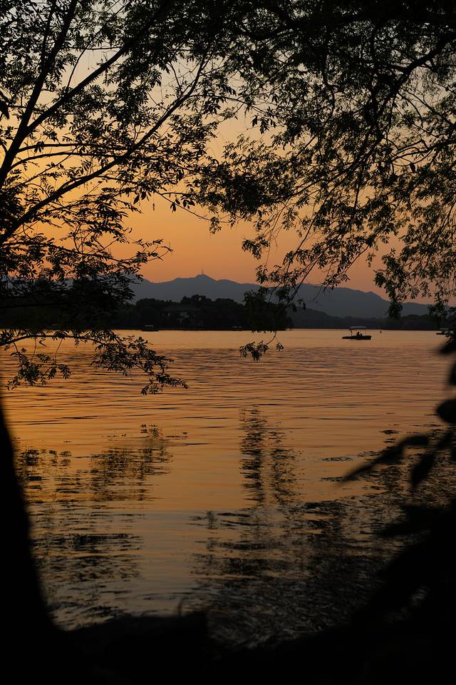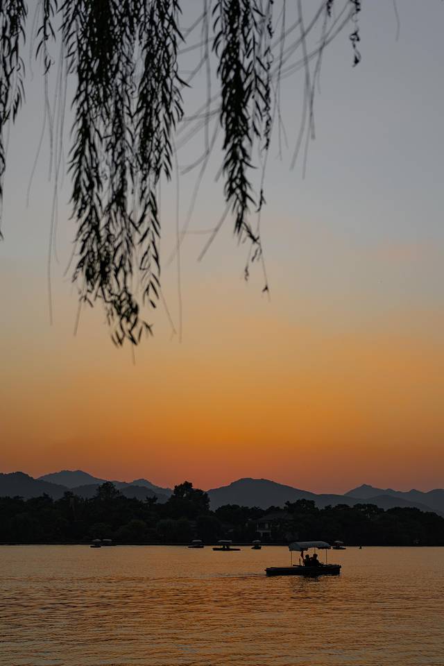 杨柳迎着秋风摇摇摆摆,天边随着夕阳的余晖渐渐的暗下去,星星开始出现在另一边的天上,还有游客泛舟于湖中,周围也逐渐的安静下来,在这日落的山海光波的浪漫中,我的心也跟着静了下来,驻足岸边,看着夕阳中的西湖,美的让我离不开眼。