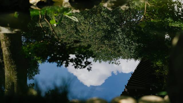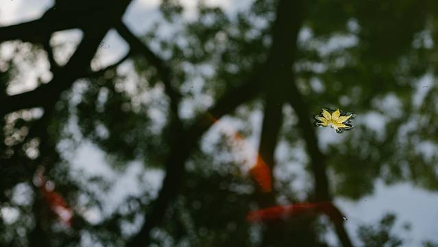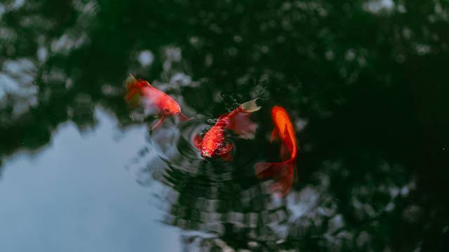 池塘里清晰的看见蔚蓝天空的倒影,成群的鲤鱼从这片倒影中游过,虽然它们不能上天翱翔蓝天云朵,但是能在池塘映射的美景里畅游也是一种幸福。
