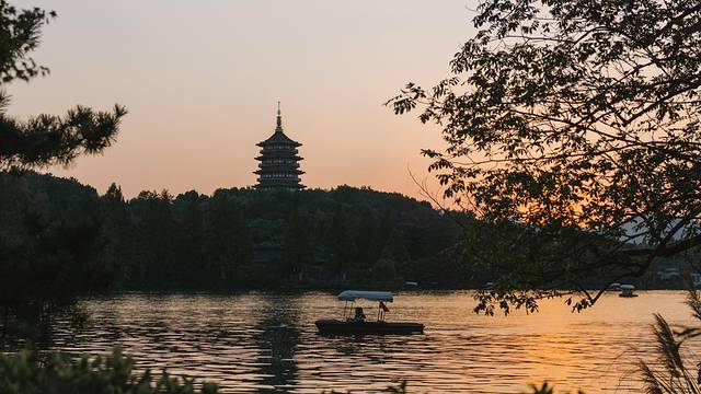 步行15分钟来到西湖,夕阳下的西湖好美,暖暖的湖色,波光粼粼。
