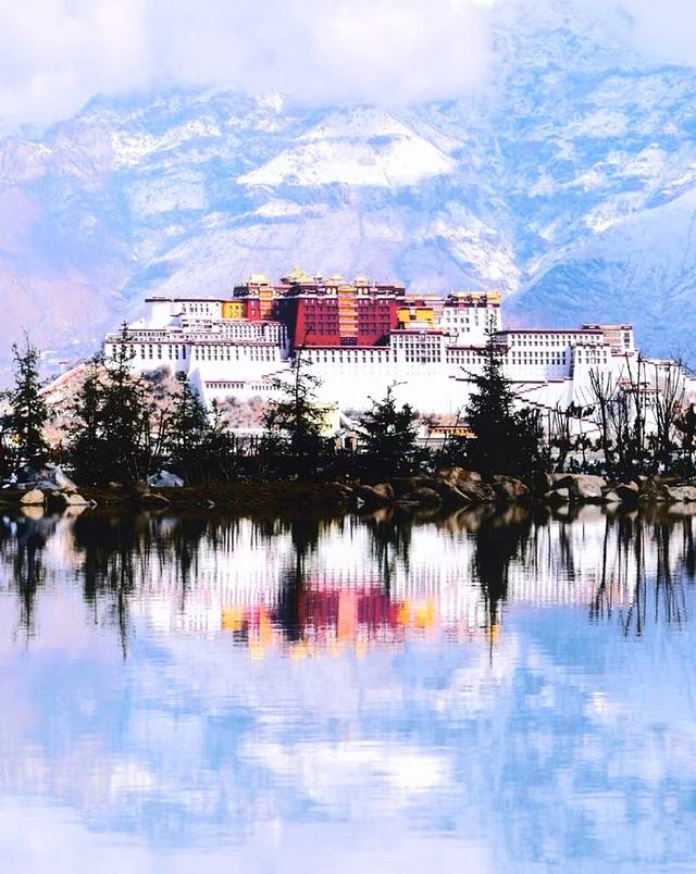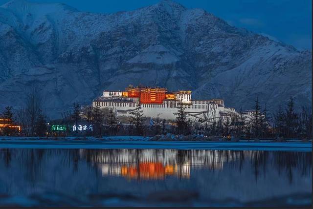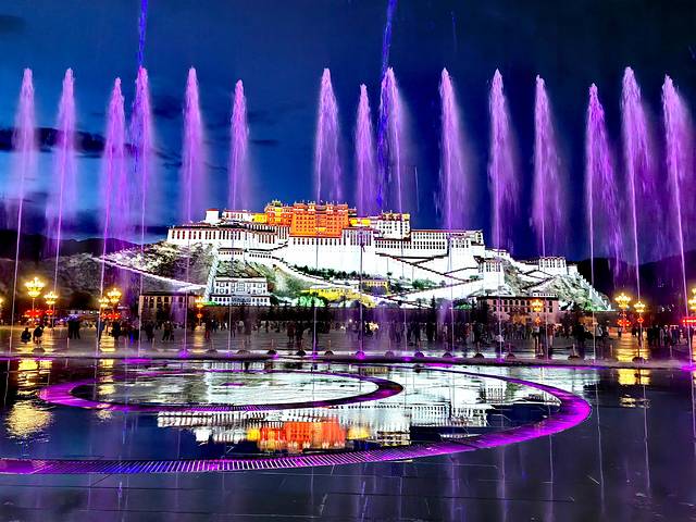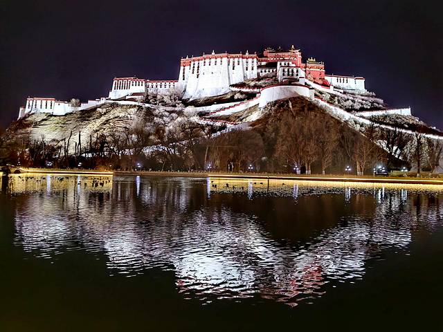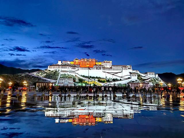 我们在成都乘坐川航3U6633航班于中午十二点过到达拉萨贡嘎国际机场,然后乘坐机场大巴到拉萨市区的民航局大院下车,根据地图导航步行约十多分钟就到达了我们提前预定的离布达拉宫较近的酒店——拉萨倾城观景酒店,也可选择坐人力三轮车或的士到酒店,费用十元。到酒店放下行李,小小休息会儿就出门去逛了逛酒店附近的宗角禄康公园,也就是布达拉宫背后脚下的龙王潭公园,还去了药王山拍照留念,这个地方是人民币50元的背景图。晚上又去布达拉宫广场逛了逛。因为第一天到拉萨,主要以休息、适应高原环境为主,特别提醒的是刚到拉萨的前两天,朋友们最好不要洗澡哟,否则容易高反。