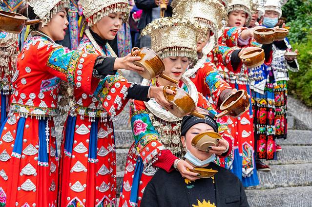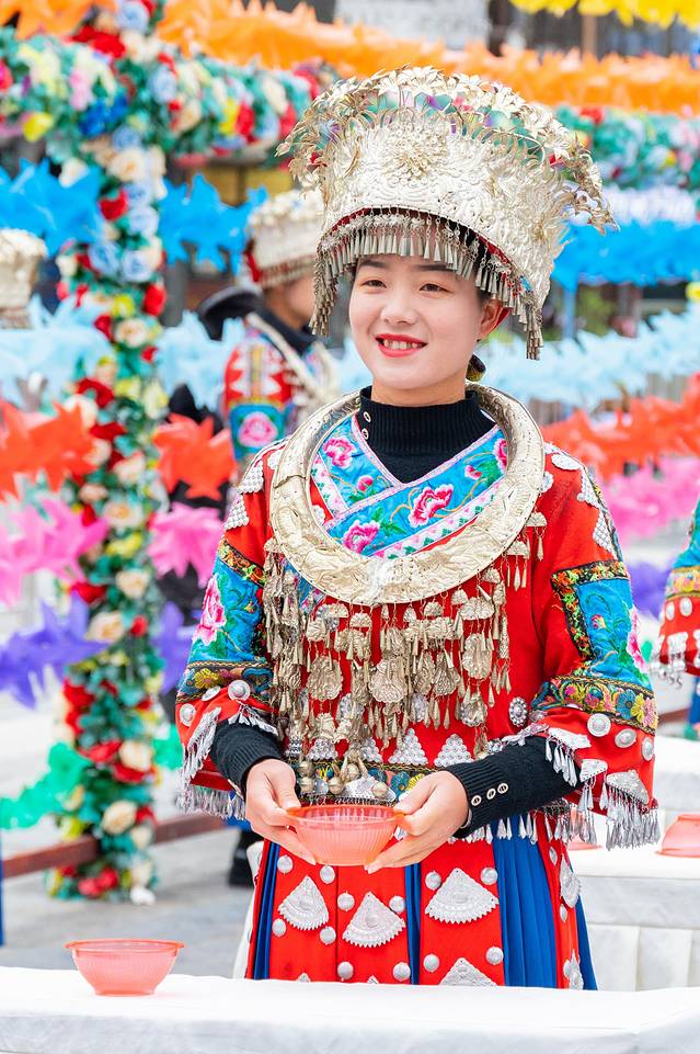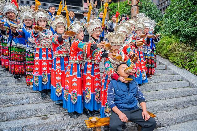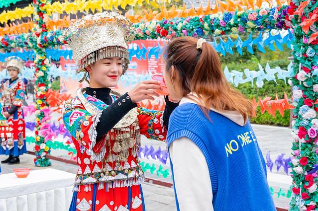 苗家阿妹PLUS版本的“高山流水”绝对是情意满满。甘香的米酒和甜美的歌声,大家见势都争先恐后地去体验了一下!酒是低度的米酒,主要以体验为主,不会把人灌醉的。但歌声是真的好听,五十六个民族,五十五个载歌载舞绝对不是吹的,哈哈!