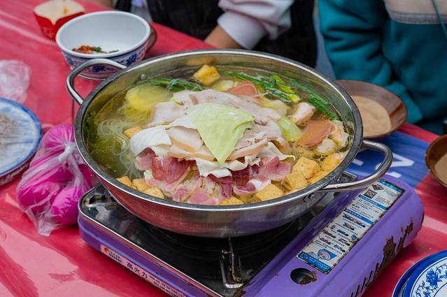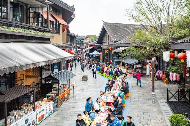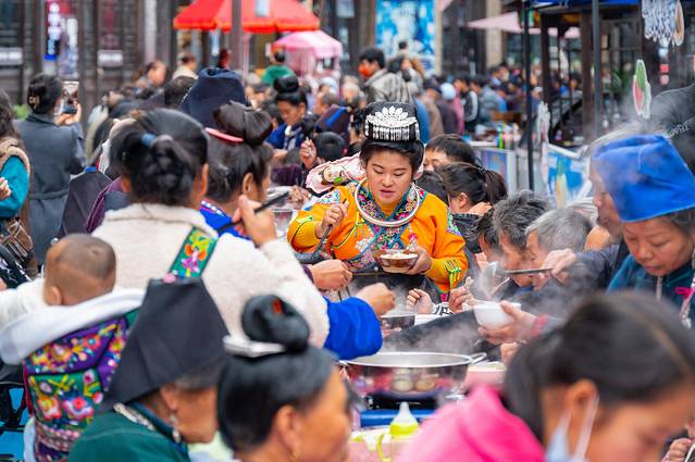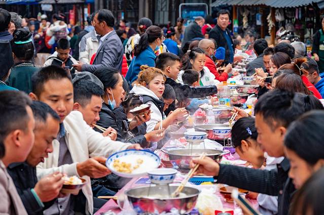 随着饭点的到来,游客和当地的居民也是越来越多……大家混坐在一起,颇有几分民族大团结的意思。声势浩大的宴席贯穿小镇街区,一眼望不到头。不仅能品尝到苗家特色美食,还能体验到淳朴的民族风情。