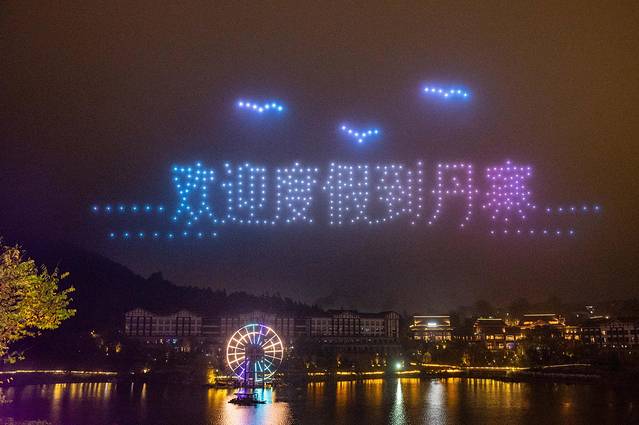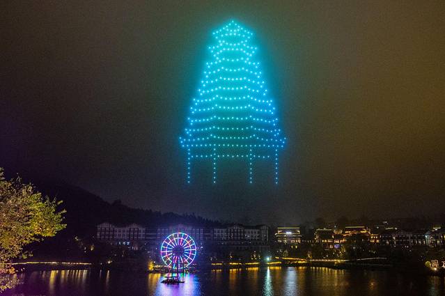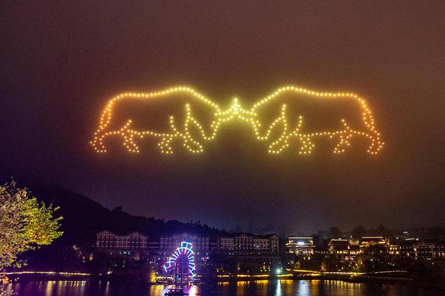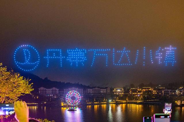炫彩无人机灯光秀的最佳观赏处也就在鼓楼旁的观景台。当晚,据现场主持人介绍,共有320架无人机在小镇集结。首先出场的是80架载有孔明灯的表演飞机,先是把祝福送给了在场的观众。接着表演无人机又随着音乐变换阵型,320架齐出动!一会摆出斗牛,一会摆出鼓楼等各类 丹寨 特色的图样,现场几乎每个人都拿手机记录下了这精彩的瞬间,分享给了家人和朋友。