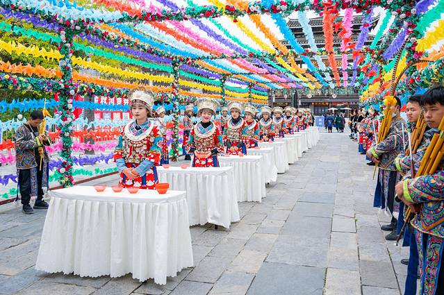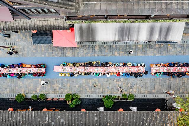 中午吃饭的时候,在街区里见识到了苗年节的万人长桌宴,氛围那叫一个好!之前在其它地方也见到过长桌宴,但是像这个规模,这么长的长桌宴我还是第一次见。着实有一些震撼!