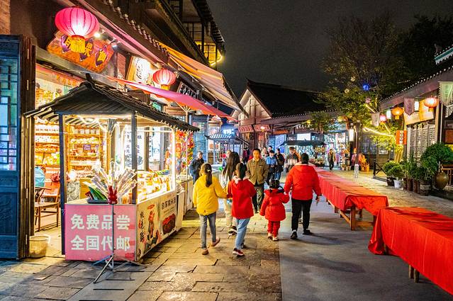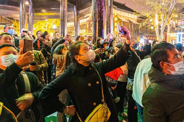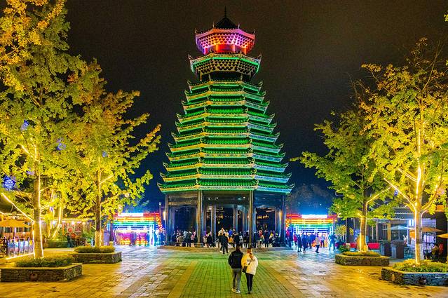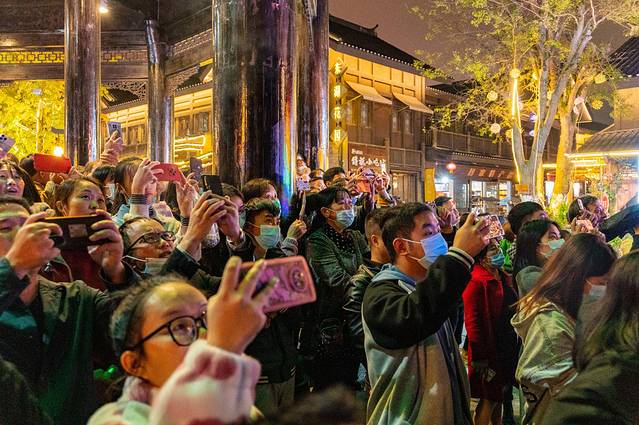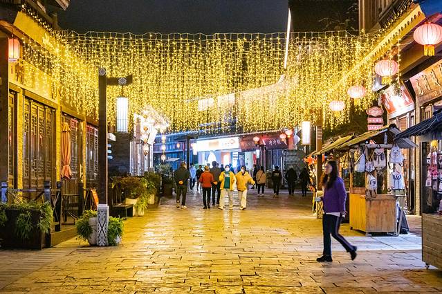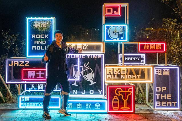 白天在小镇玩到晚饭时间才走,当夜幕降临时,我和朋友又来到了小镇。因为住在小镇附近,随时都能步行过来。此时,街头民谣音乐节和炫彩无人机灯光秀是重头戏。