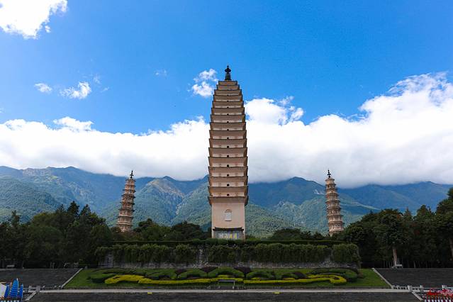 崇圣寺三塔始建于唐朝开元年间,分为前区三塔、后区崇圣寺两部分。原有“三阁、七楼、九殿、百厦”之规模,享有“佛都”之美誉。