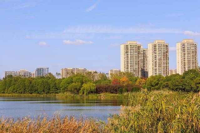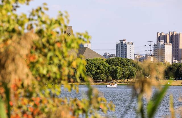 芦花轻扬的水面更显阔远,远处的高楼与湖岸秋色交相辉映,宛如水墨丹青。
