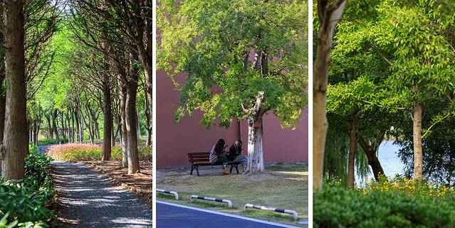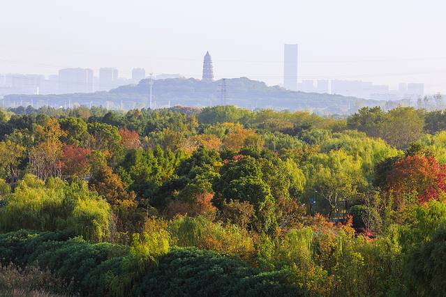林木环绕的虎丘湿地公园,树叶微斓、晚风渐凉。