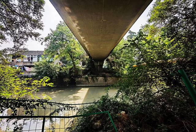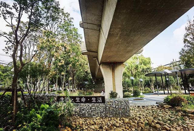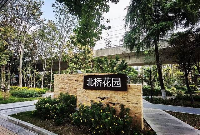 北桥花园,东临无名路,西至沪闵路,南濒俞塘河,北接北松公路,其实它就是一个敞开式的公共绿地,一个很普通的街心花园,隔着沪闵路,它与明代古银杏遥遥相对,花园上空是轻轨5号线的高架。