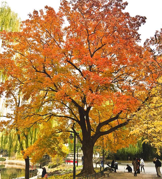 今天雾雾的,就没远走,又到紫竹院走走,紫竹院的秋天还是很值得一游的。从东门进入就可看见几棵高大的枫树,色彩艳丽,造型美观,很是养眼。今天是沿湖南侧走的,路上还见到几棵不错的枫树,其中一棵简直可称完美,在树下欣赏了半天,若是光线好会更美艳。