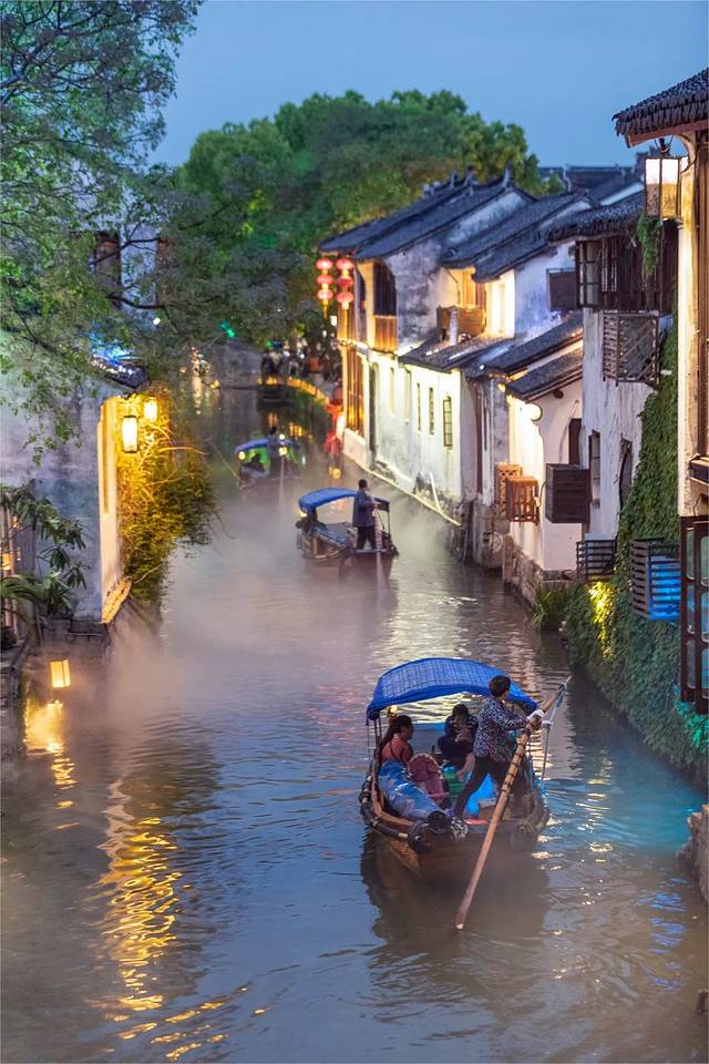 夜幕下,河面水雾缭绕,小船徜徉在波光粼粼的水巷,桨声推开夜晚的柔波,荡漾出细细的涟漪,如同古镇流淌的轻音,悦耳动听。