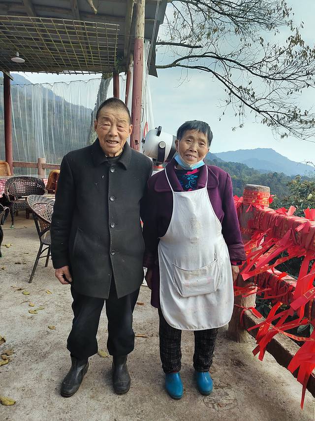 我和摊主罗老头相互祝贺八十大寿,给他俩照了相。他们老俩口去年上山后一直住在山上,偶而下下山,在这儿开餐馆和旅社,收入颇丰。三个儿子在山下的红岩村都开了民宿馆,日子过得不错。