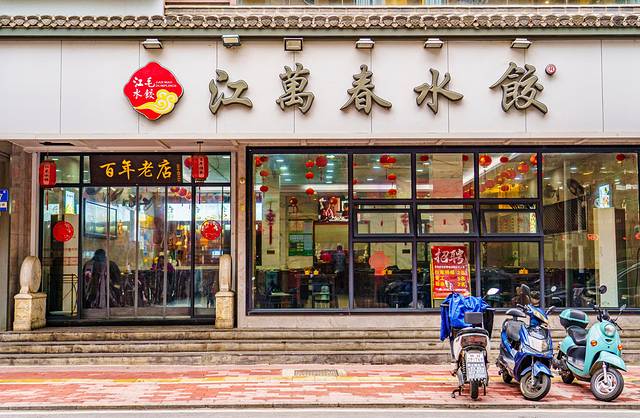 【江万春水饺】:距今已有134年的老店,地处古城中心地段,从门头的“百年老店”四个大字就能看出其底气,事实上也确实很好吃,因为我只有一个人所以仅点了两份餐食,一道超级鲜美的鸡汤馄饨,也就是店里的头牌热门美味“江毛水饺”,算是很有特色的一个叫法了;再来一盘我们平常吃的水饺,配上一碟老醋,口感十足,吃完到倒扒狮步行街、长江边上游玩都不远、很方便。