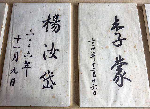 在园内西侧还建有31.9米的长碑廊,镶嵌了11块赵朴初先生的书法作品碑刻,当然也可以进到室内,里面展柜也有亲笔手迹。