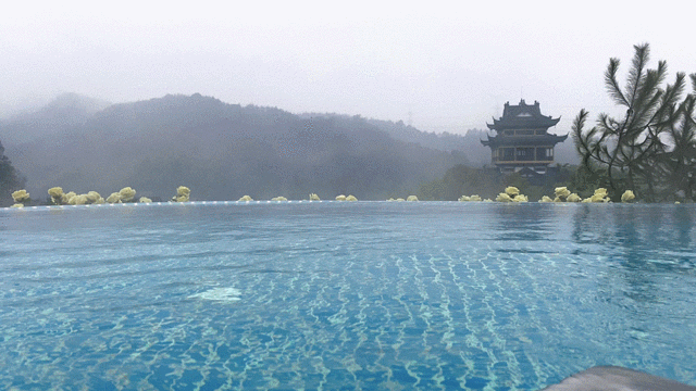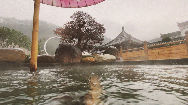 池,雾气缥缈间,相映成趣,颇有一种古色古香的氛围感,俨然一副中式山水画。伴随着大自然的气息,听着水流声,生活里的疲惫也随着不断升起的水雾烟消云散。