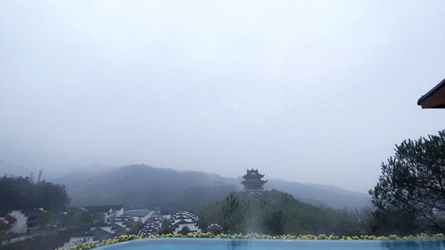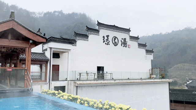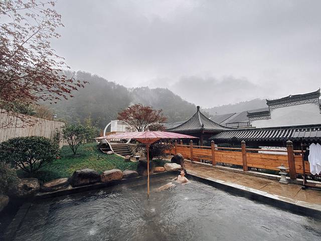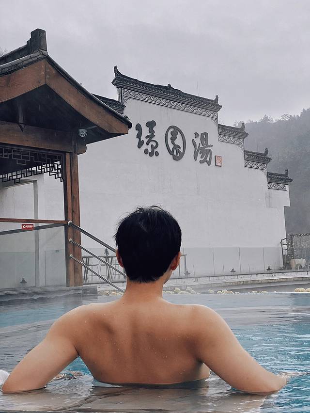 我最推荐的是室外可以俯瞰古建筑群落的无边汤池。抬眼是大片清雅的徽派建筑古民居,身下一汤温泉,热气弥漫,任远处云雾簇拥翻涌,闭眼放空,真的是太惬意了。这里也是很多人最爱的打卡拍照地。