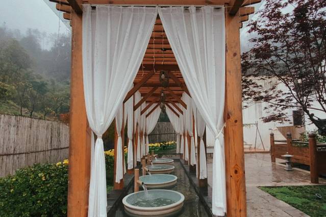 下了车,穿过高低错落的一众古建筑,武义别有特色的璟园汤就藏在这里。正是因为璟园汤的位置依山而建,又处于相对较高的地势,所以私密性非常好。
