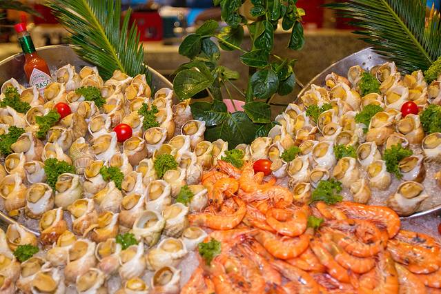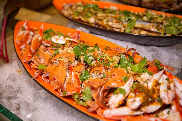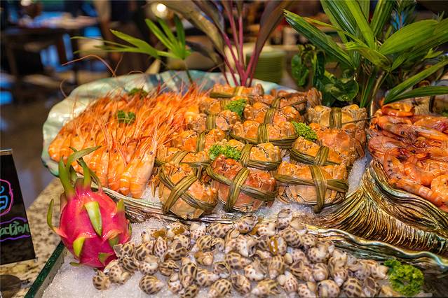 丰盛海鲜不限量海鲜供应,罗氏虾、大闸蟹、翡翠螺等一应俱全,新鲜的口感刺激着舌尖上的每一个细胞。