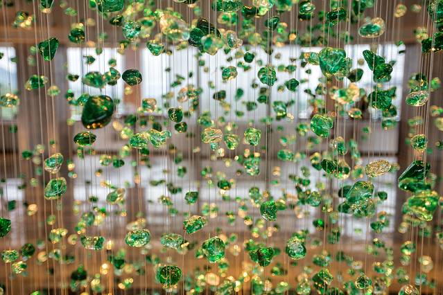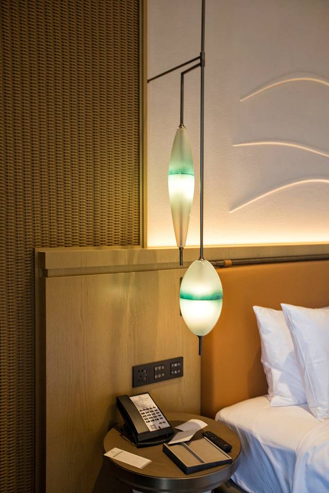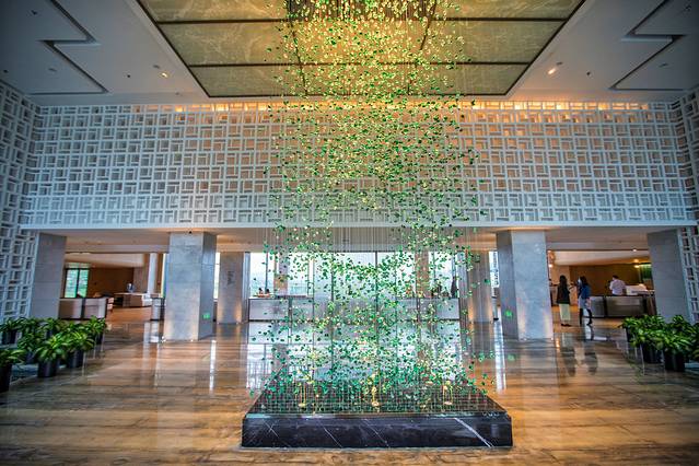 大堂中央的灯饰仿佛是垂悬于天地之间的琉璃,又像是包裹着绿氧的气泡所组成的瀑布。