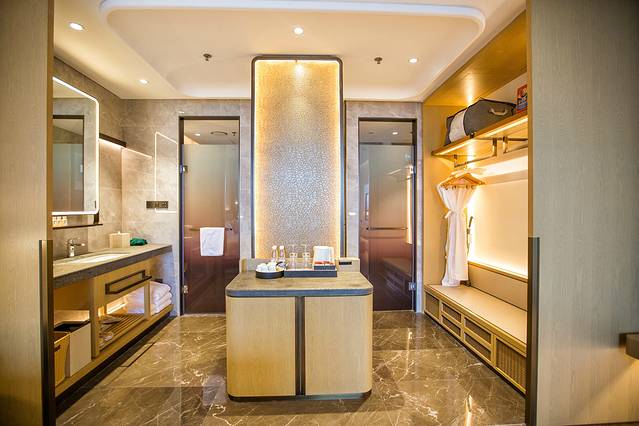 房间以淡雅的浅咖啡色为主调,房间内由外至内分为室外温泉泡池区、办公区、休闲区、睡床区、衣帽间、梳妆区、浴室干湿分区。