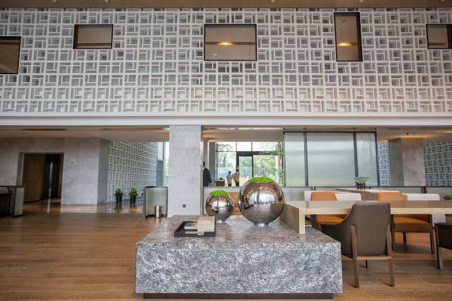 合汇酒店的酒店大堂很有耳目一新的感觉:方格形的装饰墙与四处点缀的艺术摆件互相辉映,