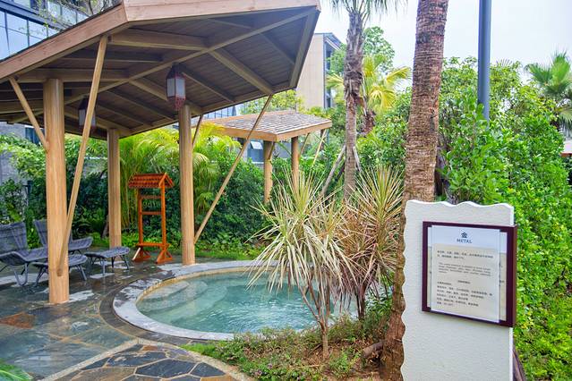 户外泳池区共有19个特色泡池,结合金、木、水、火、土五行各对应人体的肺、肝、肾、心、脾部。