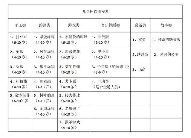 孩子们可以参与的活动项目十分多样,主要分为四大类: