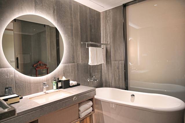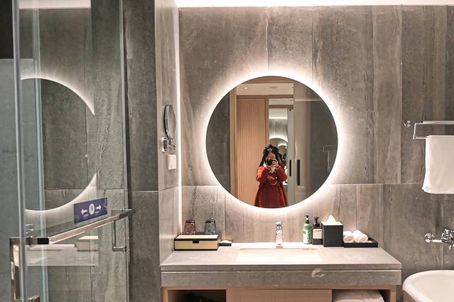冷灰色的墙面,搭着暖色的镜前灯,令我倍感舒适;