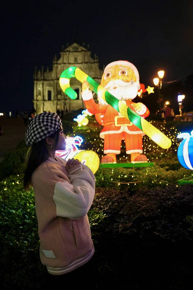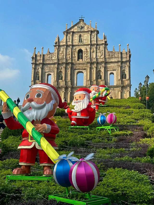 此时临近圣诞节,大三巴牌坊一侧的绿化带里添置了一排圣诞老人,真的太可爱了,晚上圣诞老人还会发光,圣诞氛围感满满,让人忍不住赶紧合影起来。还有恋爱坊也是拍照的点位,分分钟解锁各式海报大片。