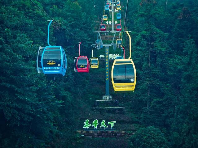 乘缆车上山顶大概需要十五分钟,原本有点微恐高的我以为缆车下会是百米的高空,但不然,下面竟是一层层的梯田,每一层梯田还会有一句有关茶的标语,比如“千秋蒙顶”“茶香天下”等等,看着下面的梯田和标语,上到山顶竟没有一丝的恐惧,但这里还是要提醒一下,缆车上下车的速度太快,到景区的老年人上车时一定要注意安全哟!