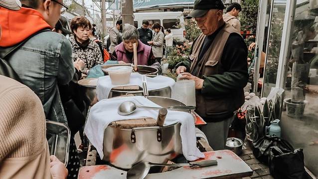 每年在苏州的冬天,我都喜欢去皮市街逛逛,排队去买上一碗热气腾腾的潘玉麟糖粥。但是他们家可不是想买就能买到的,出摊比较随机性,全凭心情。据说中午开始卖,卖完就收摊,一般下午3点钟之后来,肯定没了。而且只收现金,所以你要来买,记得要带现金哦,爷爷负责装粥,奶奶负责打包收钱,一般在皮市街172号花鸟市场北门外(史家巷西口)出摊,你会觉得这队没有白排,熬制的很浓稠,而且甜而不腻,加了桂花很香~每天是限量供应的。我每次都买不同的几份,糖粥+桂花酒酿小圆子,入口即化,吃了还想吃~