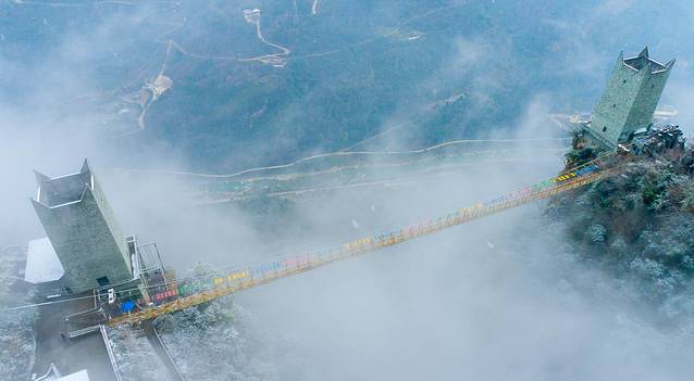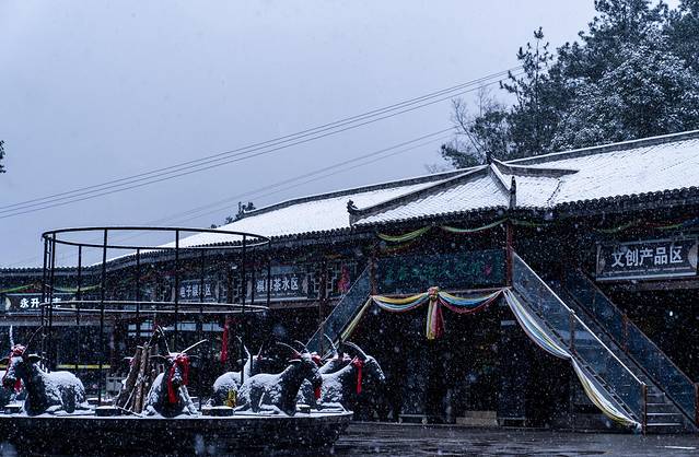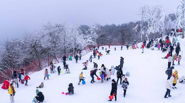 冬季的话雪景基本就在景区的后山了,第一段缆车下来之后还在景区的前山,需要继续向山上走才能到达后山,可以选择步行走景区游步道或者中途有一个高空滑道可以代步,经过一段小吃街,可以品尝特色小吃补充体力或是小憩,之后转乘去往后山的缆车到达山顶之上。