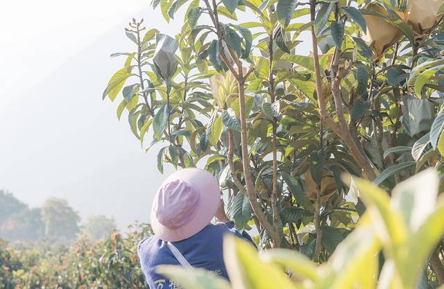 现在正值疏果的季节,枇杷树旁,村民正忙着把生长不够优良的水果摘掉,把个大个头的用纸袋包起来。