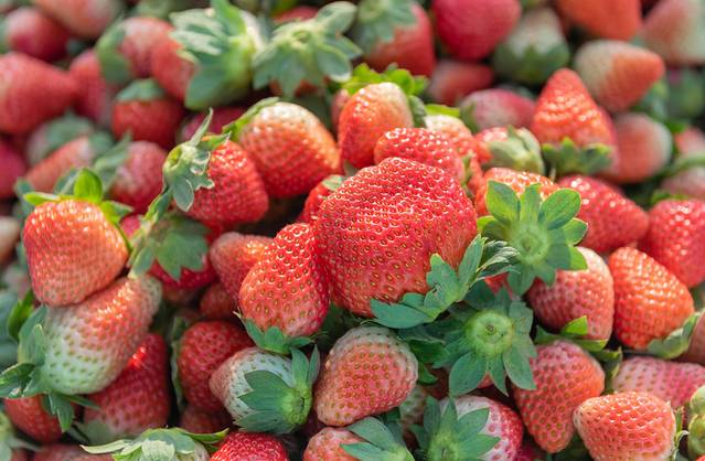 我们把车停在路边,顺着小道走到田边,老板正在为丰收季节的采摘而忙得手忙脚乱,头也不抬的对我们说到,边上刚刚采摘的草莓随便品尝,并反复对我们说:一定要挑大个的,大个的甜。