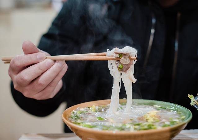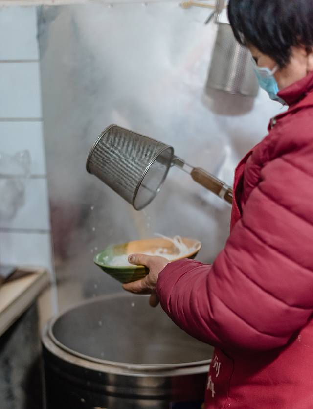 水开下粉,然后再加两片羊肉,盛上一勺秘制的汤底,撒上一把葱花,一碗醒神的羊肉粉被端上桌。