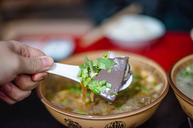 一进门就闻到了羊肉香,按照老板的推荐,我点了一碗羊肉、一碗羊杂,以及一碗酸菜羊血,热乎乎的羊肉端上来,完全闻不到一丁点膻味,夹一块沾上老板特质的蘸水,辣到合不拢嘴,可一旦这辣味在嘴里稍有减少,便立马夹上下一块。