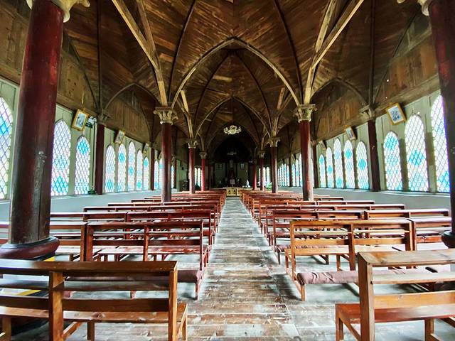 教堂始建于是1839年,教堂的建筑风格独具匠心,属于中西文化结合的产物。教堂占地约5000平方米,远观为一个中式民居四合院,主体三层穿逗木结构楼房,四周为石料墙裙,内部却是全木材料所建的法国网络圆拱天蓬礼堂,建造极为精致。