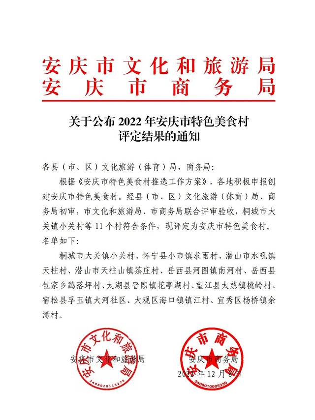 近日,安庆市文旅局和安庆市商务局联合发布2022 年安庆市特色美食村评定名单,宜秀区杨桥镇余湾村上榜!
