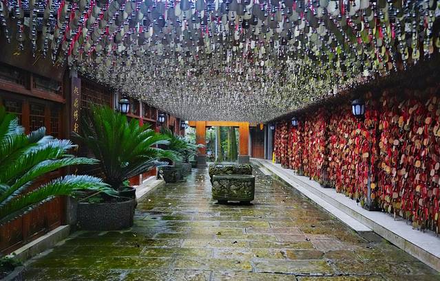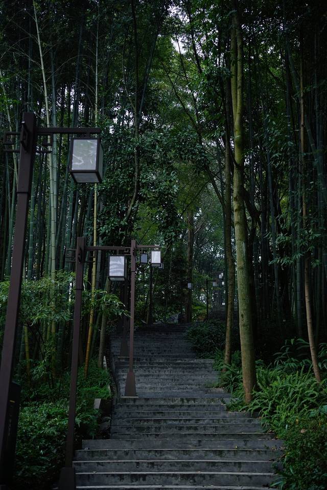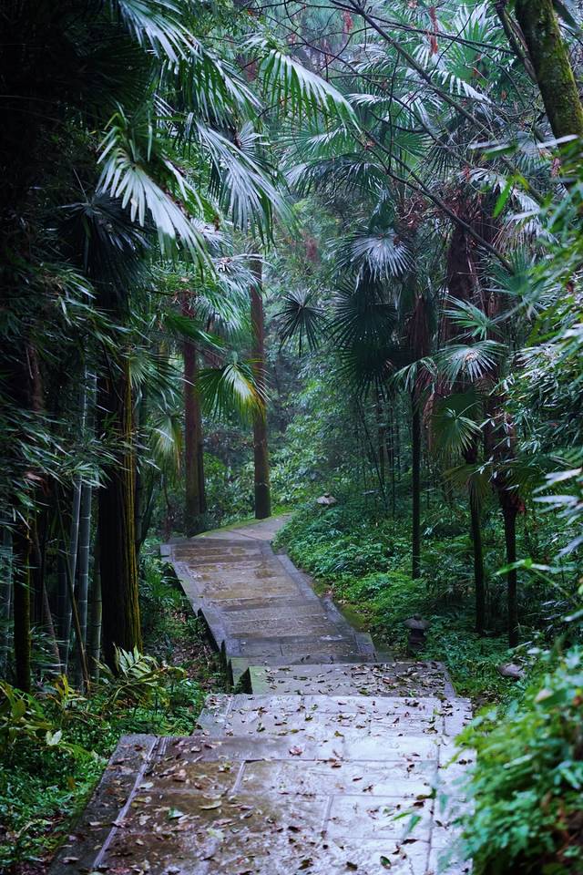 前往万年寺的途中穿过枝丫茂密的棕树林,大口呼吸着充满负氧离子的新鲜空气。也许是被山雨润湿过,林间小道漫着雨水脚下泛着哒哒声,露珠浸透了树木,表面呈现出更深层次的绿。