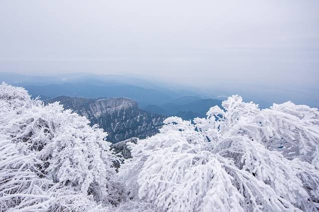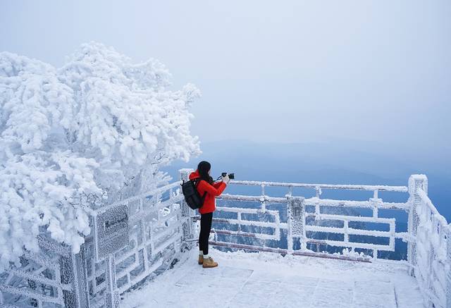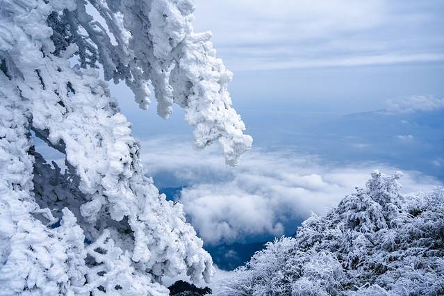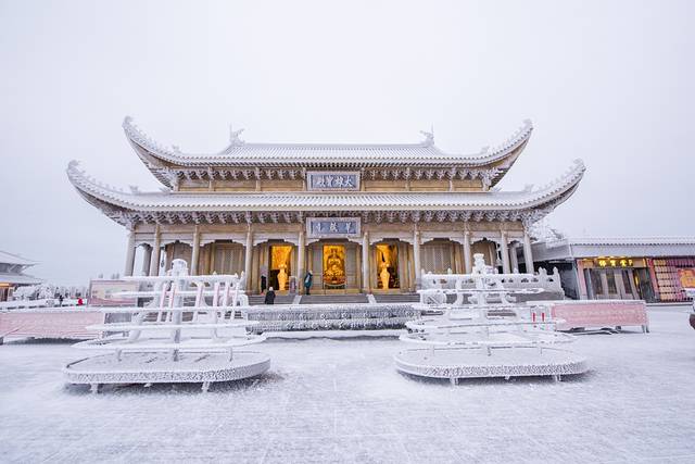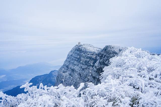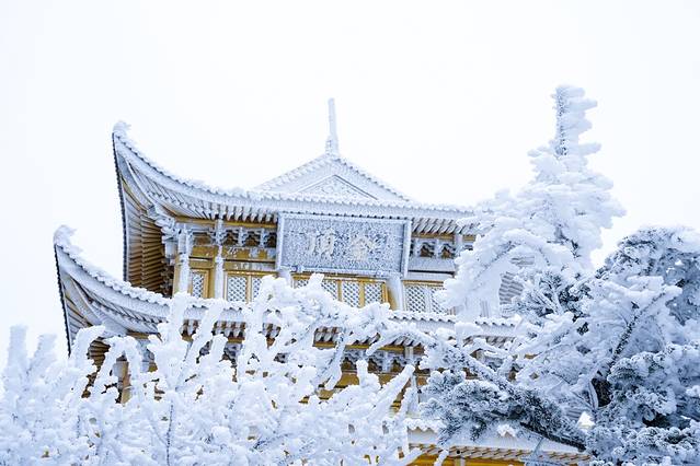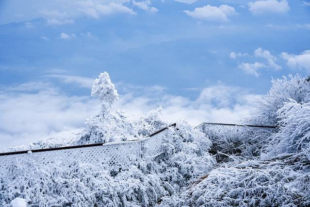 登上金顶云台,手掌开合间仿佛都能感受到细碎冰晶在慢慢消融。层峦叠云盖,碧玉砌新霜般的冰雪宫殿让人有种穿越冰雪奇缘的错觉,分不清虚幻与真实。