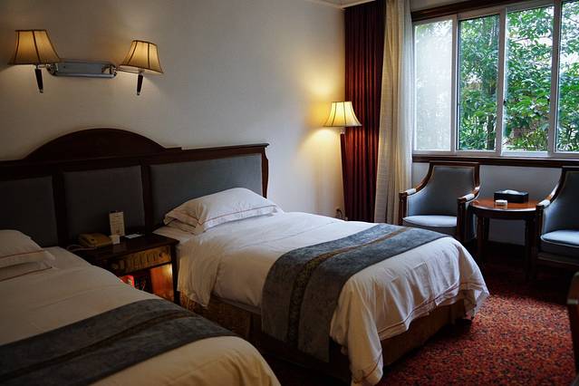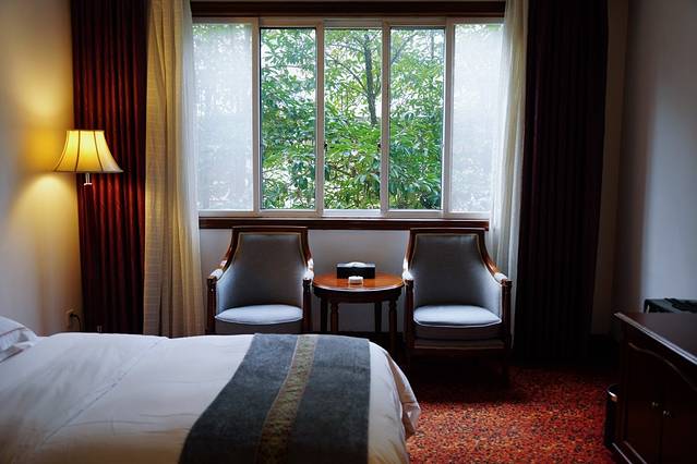 酒店内的装饰是朴素中式的,依着窗帘的灯头放射出暖暖的光束,一时间这种客居他乡的新鲜感涌上脑海,加快了我们想要探寻这座迷人山峰全部的想法。