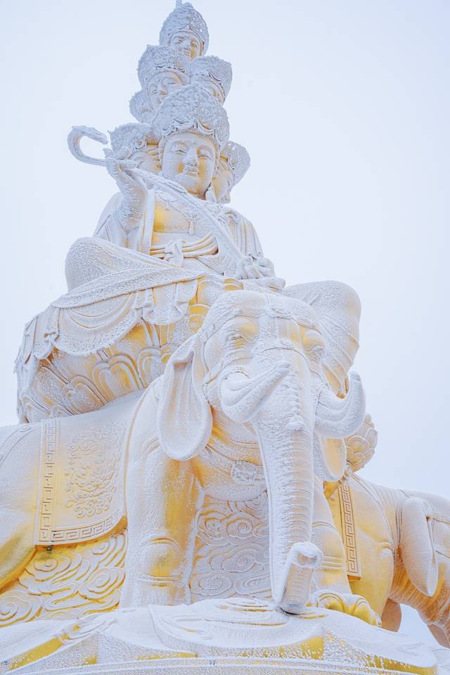 金顶的美是纯粹的雪白,整个世界在此刻已被冰雪所掩盖,如果这个时候有人问冰雪之下掩藏的是什么?我想用一句“冰雪透香肌”也毫不违和。