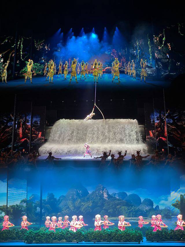 有请观众一起参加演出的环节,想参加的朋友要积极上去啦,可以获得参演证和照片。在桂林千古情中,很多场表演串连起来,每一场都用舞剧讲述着刘三姐的历史故事,有美有泪目。亮点是间有个威亚表演,看起来较为新奇一些以及最后的刘三姐站在毯子说从天而降。不好的是每一场的演员并不是很多,整体看起来舞台太大,演员太少,控场力不足 。 以上便是对桂林千古情的感受啦。
