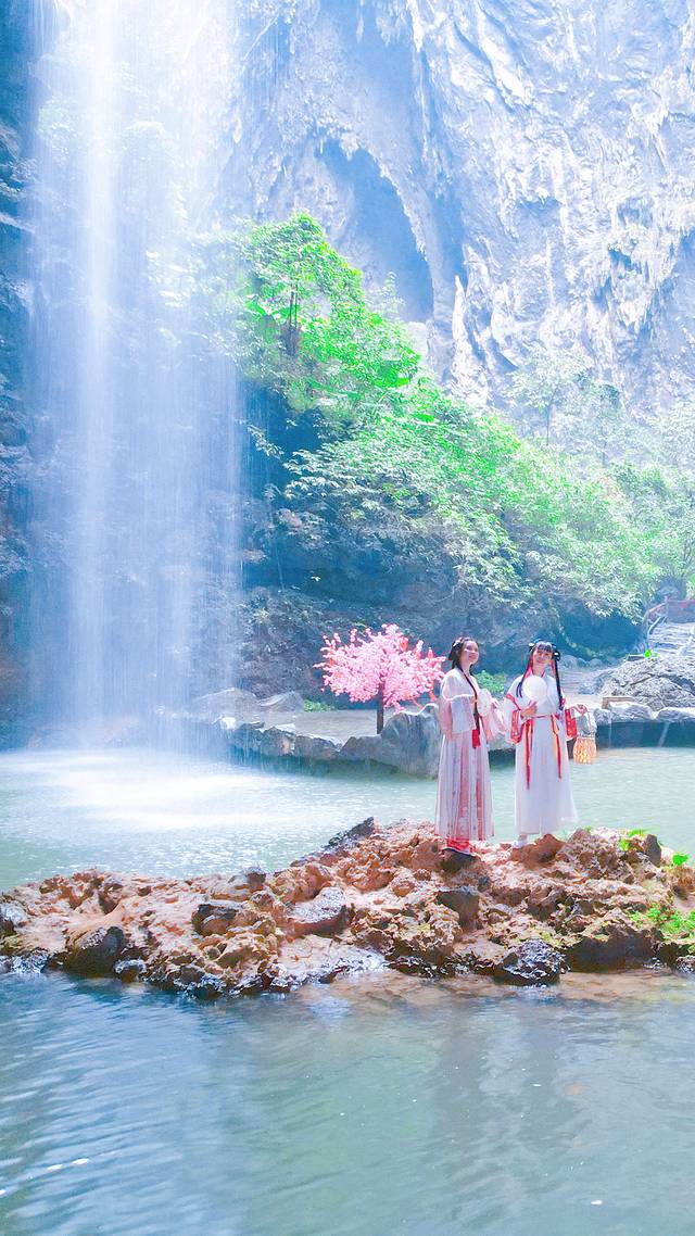 走着走着,看着万绿福岛的自然景色,我们来到了仙境瀑布之下。这个瀑布从头顶的溶洞天坑口倾泻而下,仿佛流动的水精灵一般,透明洁白,给人一种仙女下凡的脱俗感。而对面的石头之上,刚好也有一对汉服仙女提着灯笼,拿着扇子在吟诗作对,特别诗情画意的一个场景!