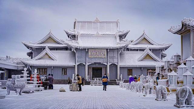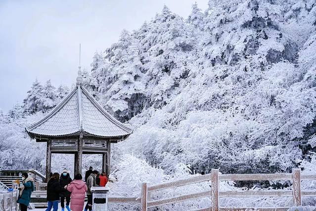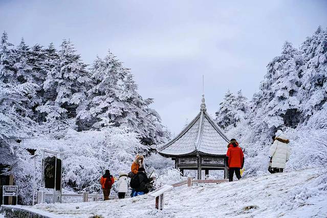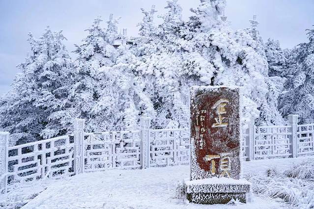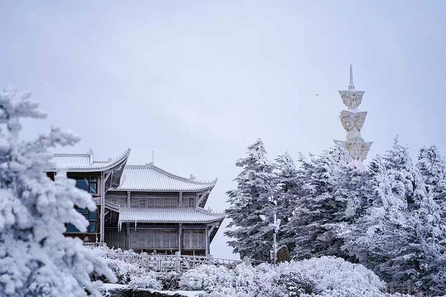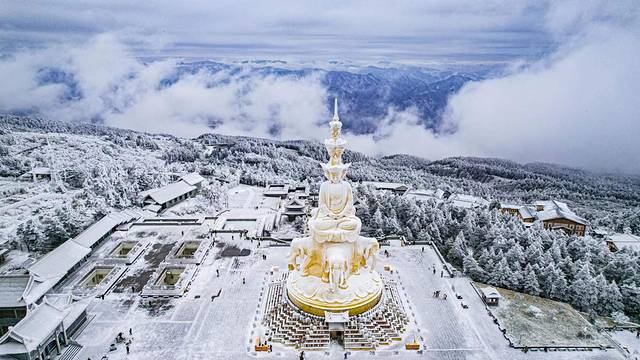 金顶铜殿:金顶最高处,有一座稀有珍品,称作“金顶铜殿”;在这里沉淀着千年的历史和百年的风霜,整个建筑的屋顶檐瓦馏金,在阳光的照射下,金光闪闪,迢耀百里,故取名金顶。如今冬季来临,再次登上金顶铜殿,四下皆被白雪覆盖,让这片土地更加庄严肃穆。晴天适合思念,冬天适合相见,或许只有白雪皑皑的世界更加让人有所期待。在夏日炎炎中的耀眼故事,转眼在冰天雪地中凝结成了冰。